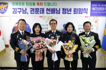 예천경찰서(서장 김기태)에서 30일 경찰서 내 사랑마루에서 경찰서장, 각 과장, 동료 직원 및 퇴직자 가족들이 참석한 가운데 퇴직자 김구남 · 권운태 경감의 퇴임식을 개최하였다.