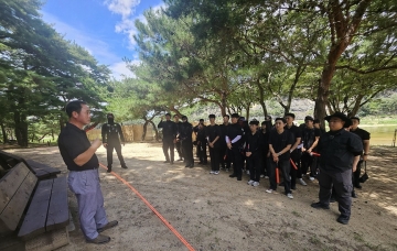 류한철 선유줄불놀이 기획책임자가 안전요원들에게 주의사항 및 근무지침을 설명하고있다.