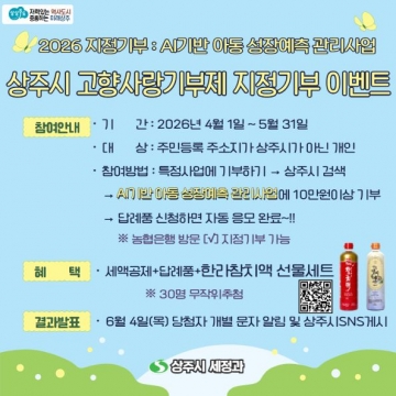 상주시는 고향사랑기부제 활성화와 지역 아동의 건강한 성장 지원을 위해 ‘AI 기반 아동 성장예측 관리사업’ 지정기부 이벤트를 4월 1일부터 5월 말까지 실시한다고 밝혔다.