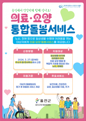 울진군은 3월 27일부터 의료, 요양, 돌봄 등 복합적인 지원이 필요한 노인, 장애인을 대상으로 의료요양 통합돌봄사업을 본격 시행한다.
